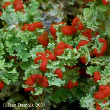 Exemple : la Cladonie coccifère, un lichen, présente des pycnides rouges.